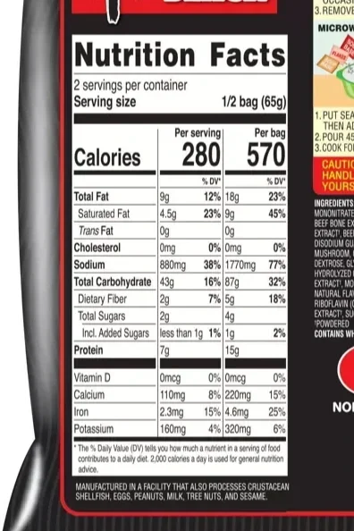 Pay attention to sodium content - this is less of a problem if you cook your own food a lot. However, if you get a lot of premade food, take a close look at the nutritional label and also serving size! This one pack of my favorite ramen noodle has 880 mg of sodium per serving. However, the serving size is listed as half a bag. Who eats half a bag of ramen?! Traditionally, it is recommended to eat less than 4,000mg of sodium per day, or 2,000mg if you have certain health conditions. However, now a lot of physician recommend reducing as much as you can without any strict cutoff.