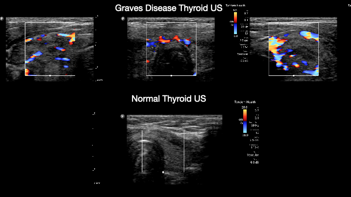 Above is an ultrasound of a patient with Graves Disease (hyperthyroidism) I performed, compared to a normal thyroid. The thyroid is visibly enlarged and hyper-vascular (red-blue color shows increased blood flow in the box). This is compared the the normal thyroid, where no color flow is seen. This helped educate the patient on what is happening in their disease and the importance of getting their thyroid function back to normal.